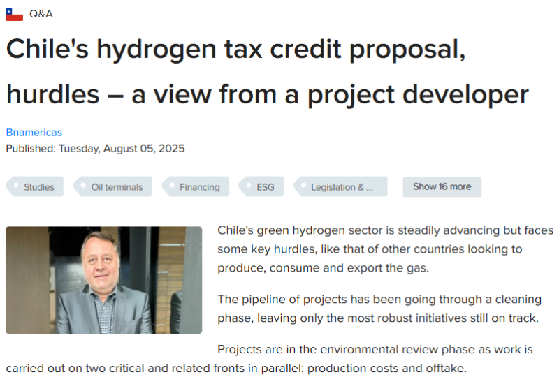 Another key point is the cost of using the electrical system. In the north of the country, if I produce hydrogen connected to the national grid, I have to pay system charges, which can reach US$15/MWh. Even if the energy is free, those charges make me lose competitiveness. Therefore, just as energy for strategic reserves is exempt from system charges, the same could be considered for hydrogen projects.