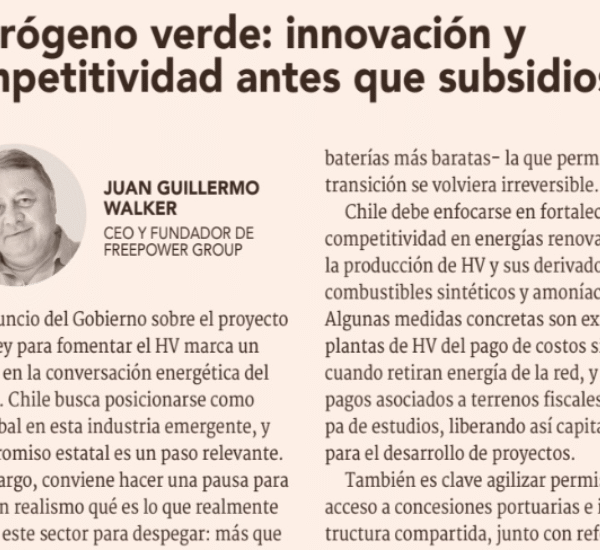 [Opinion] Green hydrogen: innovation and competitiveness before subsidiesLisa Sánchezseptiembre 8, 2025Opinion piece by Juan Guillermo Walker, CEO and Founder of FreePower Group, for Diario Financiero. The Government’s announcement of a ... Ver noticia
